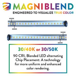 Recognizing that 3000K can be too warm and 4000K too cold, MagniBlend combines different Kelvin temperatures to achieve a balanced, versatile lighting solution. This allows for a wider color palette in environments typically set to 3500K or 4000K.The high CRI ensures that colors appear true to life, enhancing the vibrancy and clarity of products, people, and environments. This is especially beneficial in retail spaces, classrooms, and workplaces, where accurate color representation is crucial. By mixing high 90 CRI with various Kelvin temperature chips in an alternating pattern, MagniBlend brings out the full spectrum of colors, providing a more dynamic and visually appealing lighting experience. Once installed, these bars not only reduce energy costs but also improve the overall aesthetic of the space, making it more inviting and engaging for customers, students, and staff alike. True-to-Color Representation: MagniBlend enhances the appearance of products, making them more attractive to shoppers and aiding in educational settings by providing better visibility for materials. Improved Ambiance: The combination of warmth and clarity contributes to a positive atmosphere, enhancing mood and productivity in any environment.