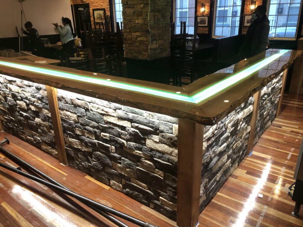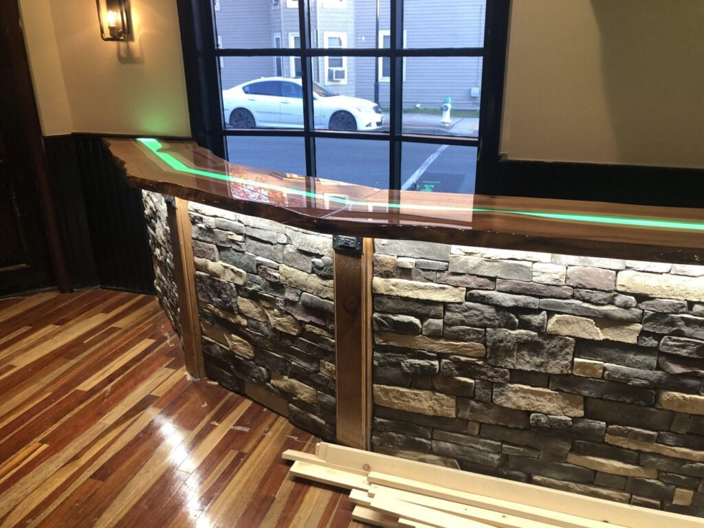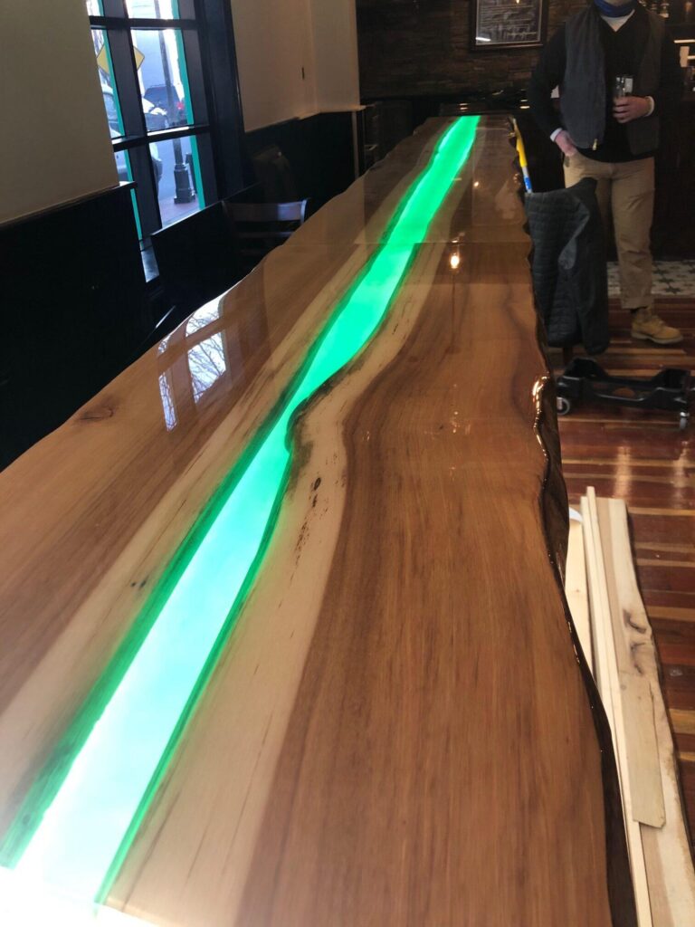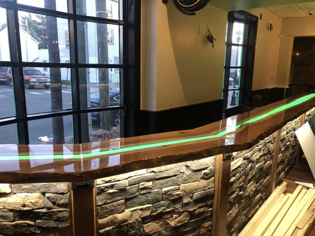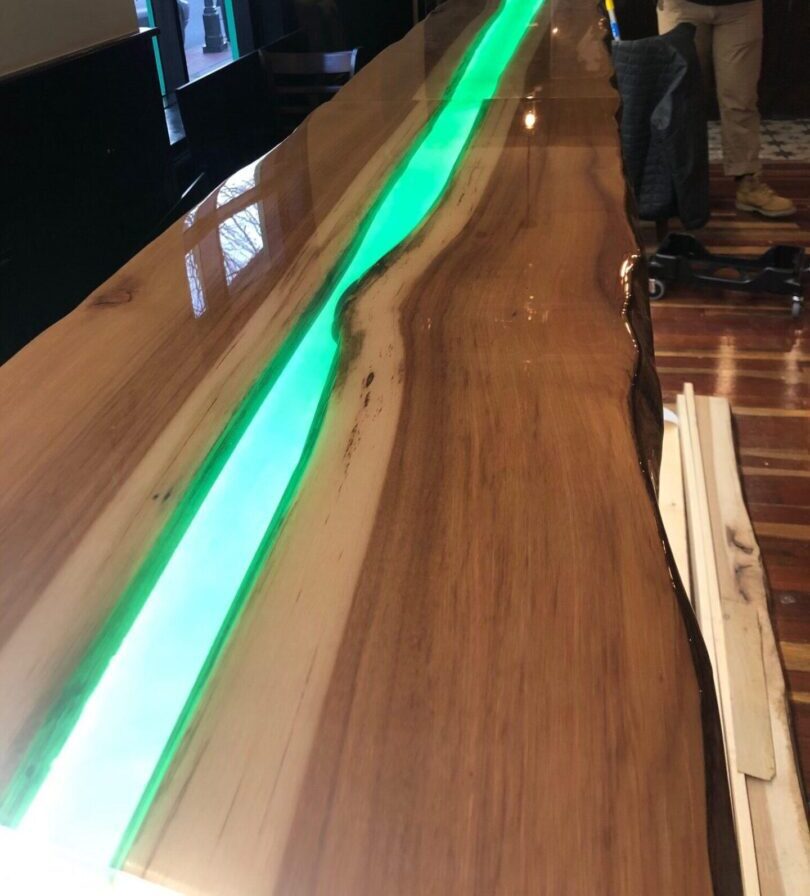 The wooden bar was constructed with a cut-out canal down the entire length of the middle of the bar and covered with green acrylic. ZLEDLighting 24V warm white tape light was chosen to glow beneath the green acrylic. The result is not only breathtaking, but creates a completely custom design to add to the character of the property.